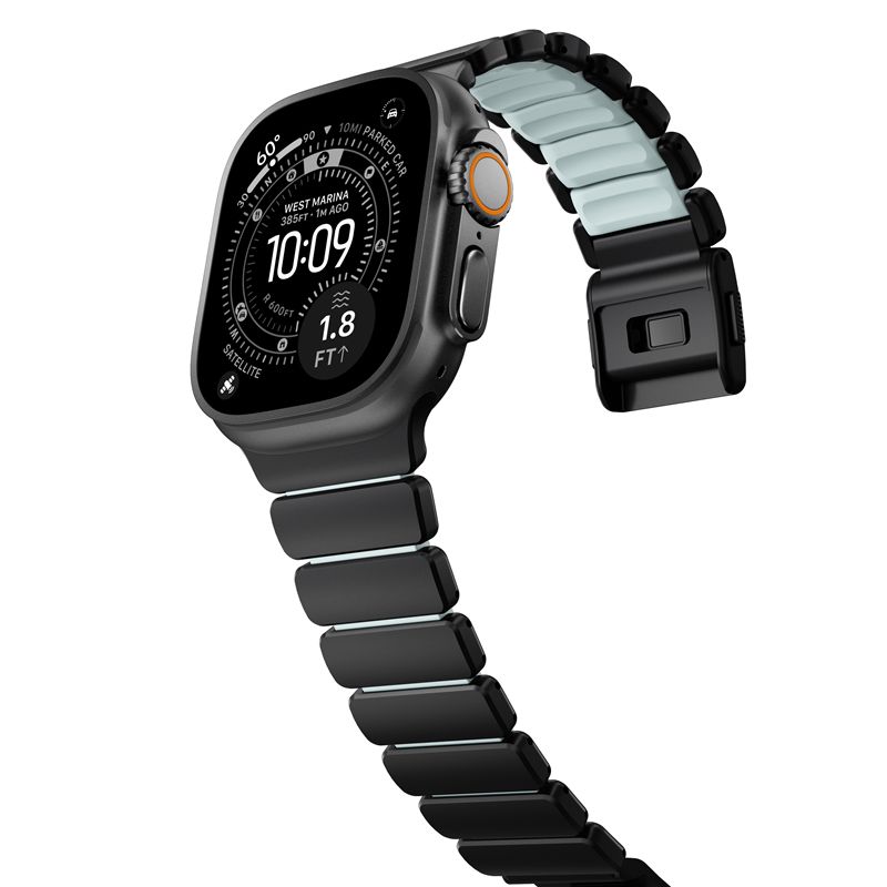 Το Nomad Stratos Band στην έκδοση Icy Blue Glow δεν είναι απλώς ένα λουράκι, αλλά ένα κορυφαίο κομμάτι εξοπλισμού που επαναπροσδιορίζει την εμφάνιση του Apple Watch. Συνδυάζοντας το Τιτάνιο Βαθμού 4 (Grade 4 Titanium) με το πανίσχυρο καουτσούκ FKM, η Nomad δημιούργησε ένα υβριδικό μπρασελέ που προσφέρει την αισθητική του μετάλλου με την άνεση ενός αθλητικού λουρακιού.