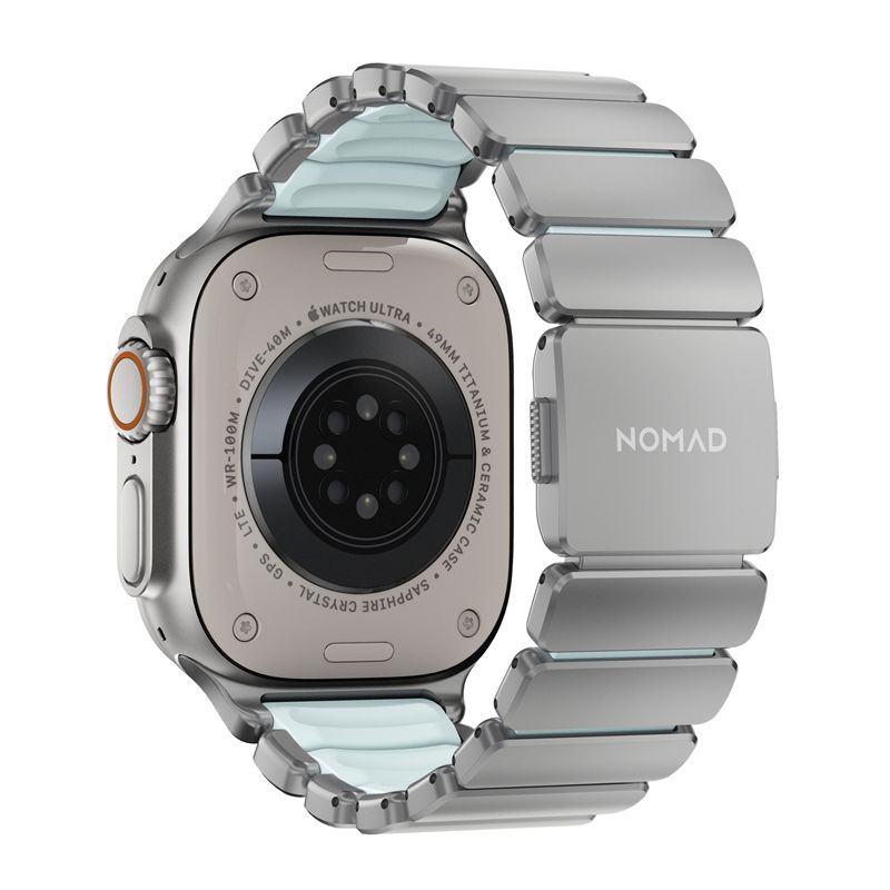 Το Nomad Stratos Band στην έκδοση Natural Titanium Icy Blue Glow αποτελεί ένα τεχνολογικό επίτευγμα στο χώρο των αξεσουάρ. Συνδυάζοντας το Τιτάνιο Βαθμού 4 (Grade 4 Titanium) με το κορυφαίο καουτσούκ FKM, η Nomad δημιούργησε ένα μπρασελέ που διαθέτει την επιβλητική εμφάνιση του μετάλλου αλλά προσφέρει την άνεση και την αντοχή ενός εξοπλισμού υψηλών επιδόσεων.