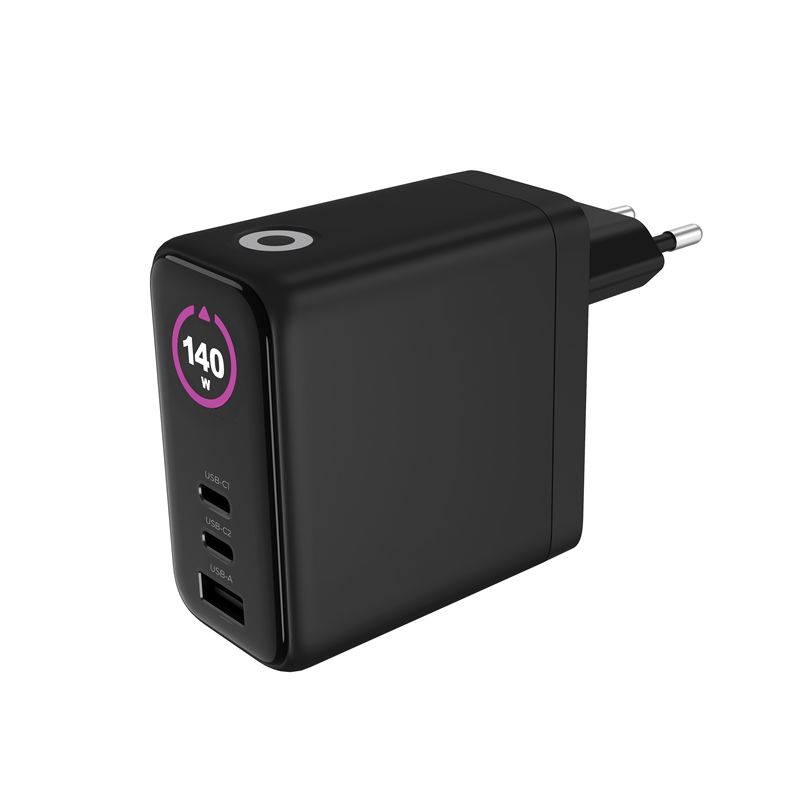 - 140W fast charging with the latest GaN technology in a sleek and compact design. Charge up to 3 devices simultaneously thanks to 2x USB-C and 1x USB-A ports. The charger includes a display for monitoring the charging performance in real time. Ideal for home and travel, it provides speed, safety and portability anywhere on the go.