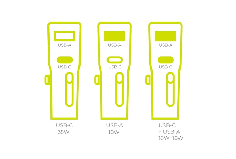 - 2x USB ports: 1x USB-C (35W) and 1x USB-A (18W)