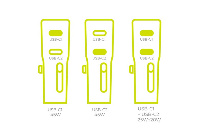 Έξυπνη Διαχείριση Ισχύος: Παρέχει έως και 45W μέσω μίας θύρας USB-C. Κατά την ταυτόχρονη φόρτιση δύο συσκευών, η ισχύς κατανέμεται έξυπνα (25W + 20W).