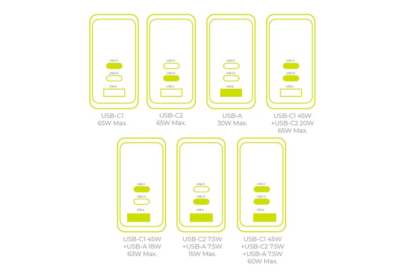 - USB-C1 + (USB-C2 + USB-A): 45W+15W (60W Max)