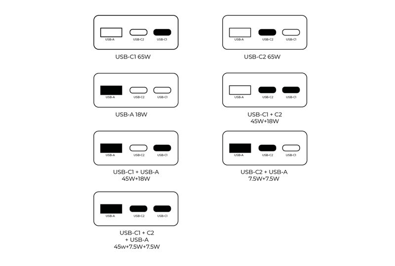 • Type-C1 + Type-C2 + USB-A Output: 45W + 7.5W + 7.5W