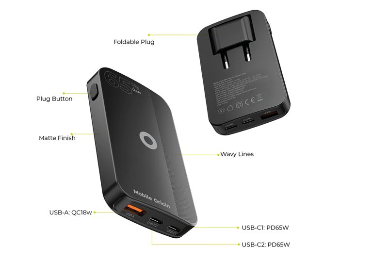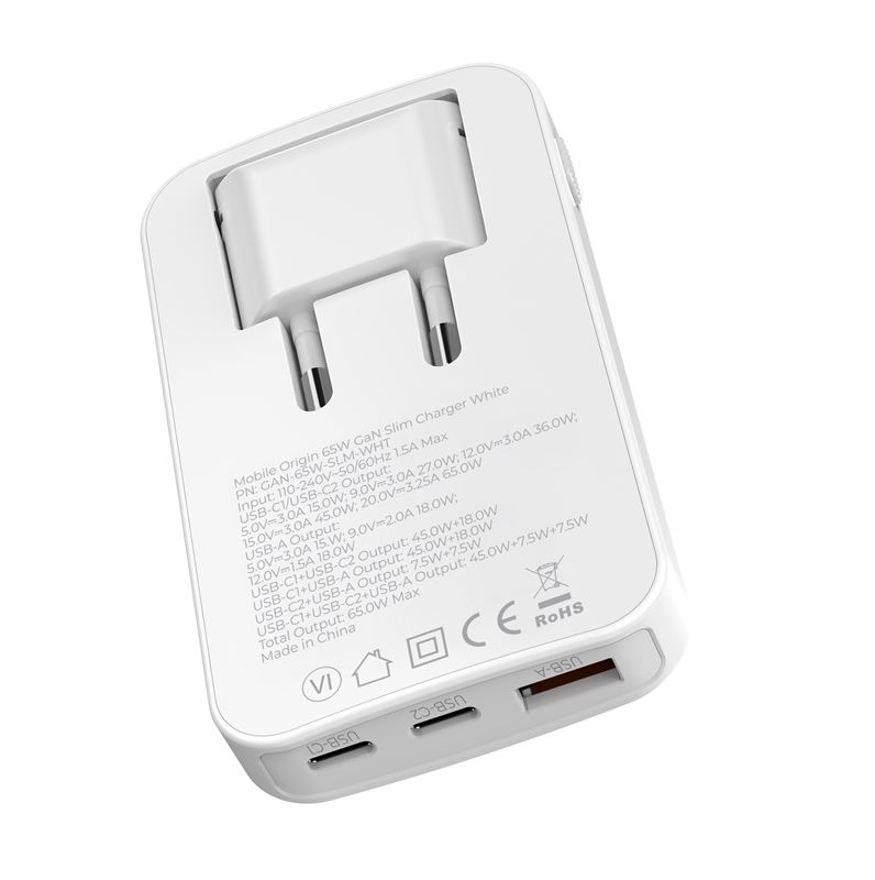 • 3 charging Pots: The Mobile Origin Slim Charger 65W delivers exceptional charging capabilities, supporting a wide range of devices. Designed for versatility, the Mobile Origin Slim Charger includes three charging ports: Type-C1, Type-C2, and USB-A.