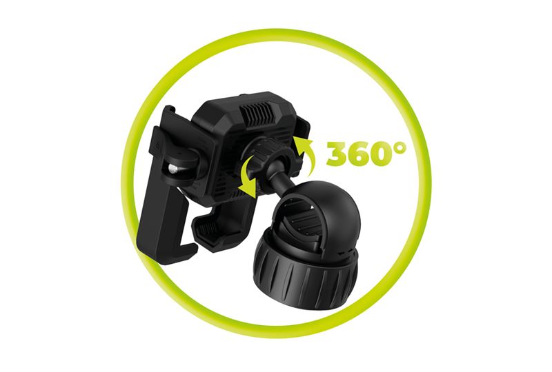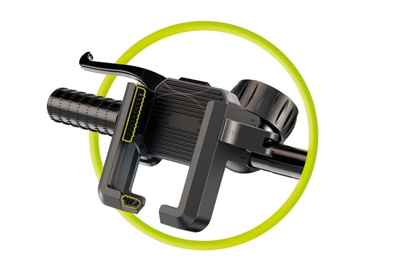 - A versatile phone holder for bikes, scooters, motorcycles, and e-bikes. It keeps your phone stable and easy to view with quick-lock functionality and full 360° rotation. Thanks to the open-frame design, the rear camera stays fully visible—perfect for capturing videos while you ride.