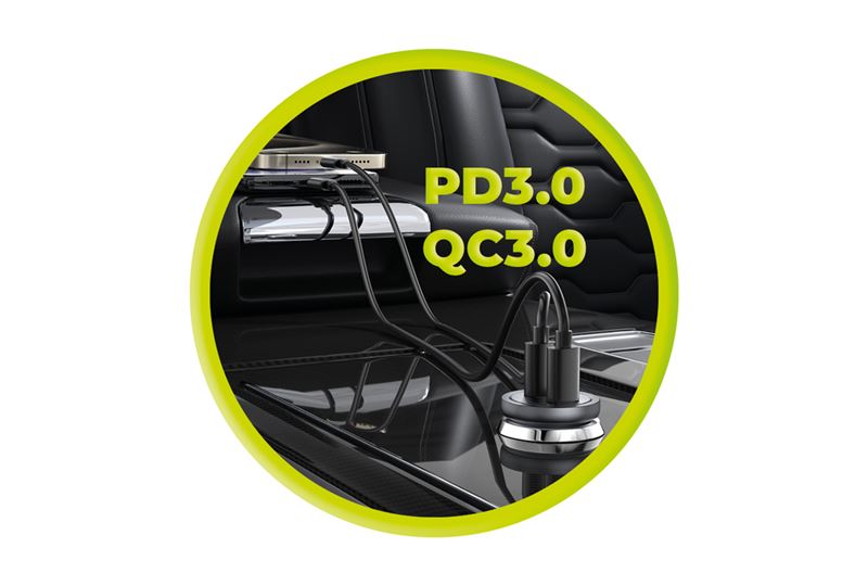 Powerful and compact car charger with USB-C, ports, each providing up to 15W fast charging. Allows simultaneous charging of two devices, supports PD3.0 protocols
