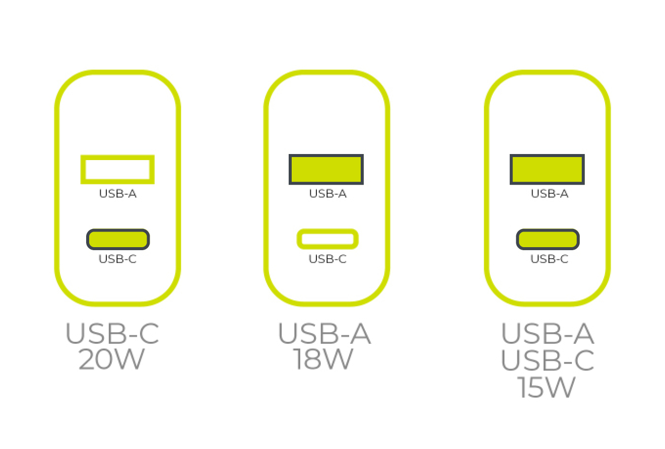 - This PD20W Wall Charger offers 20W fast, efficient charging in a compact design. Dual ports, USB-A and USB-C, are used to charge two devices at once. Combining power, safety, and transferability – perfect for use at home or on the go!