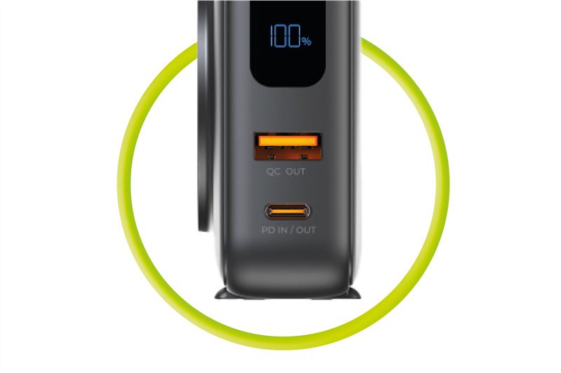 • The power bank is equipped with USB-A and USB-C ports, enabling fast charging for devices supporting Quick Charge and Power Delivery technologies. The LCD display clearly shows the charge status.