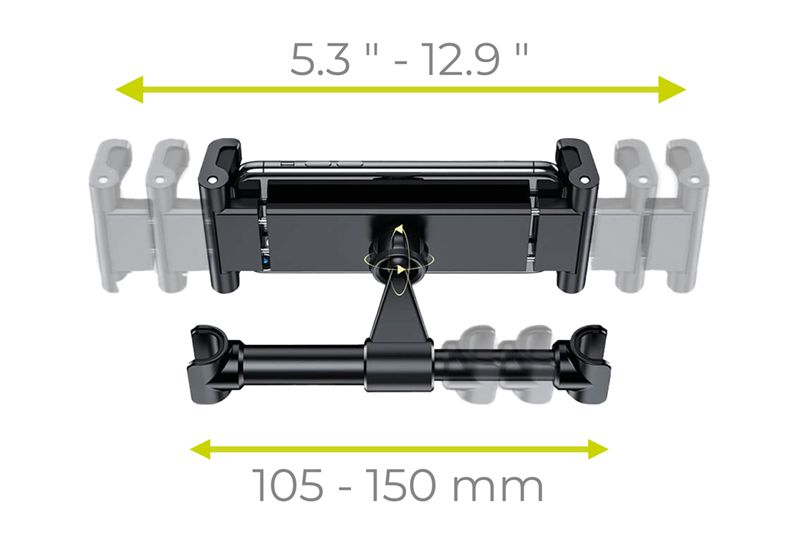 - Wide compatibility: Fits a wide range of tablets, phones, consoles (5.3 – 12.9 inch) and headrests (105 – 150 mm).