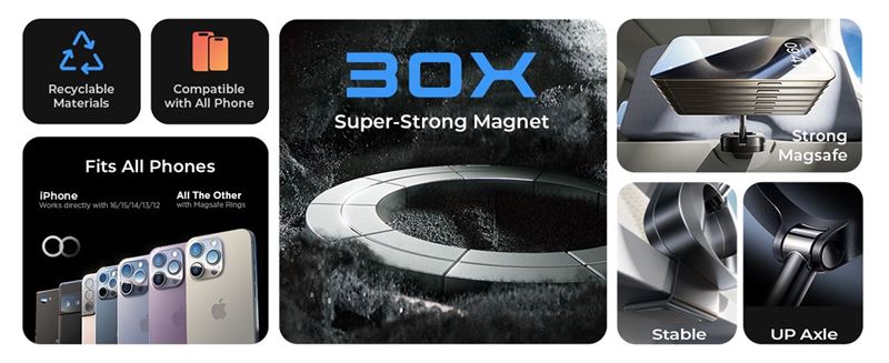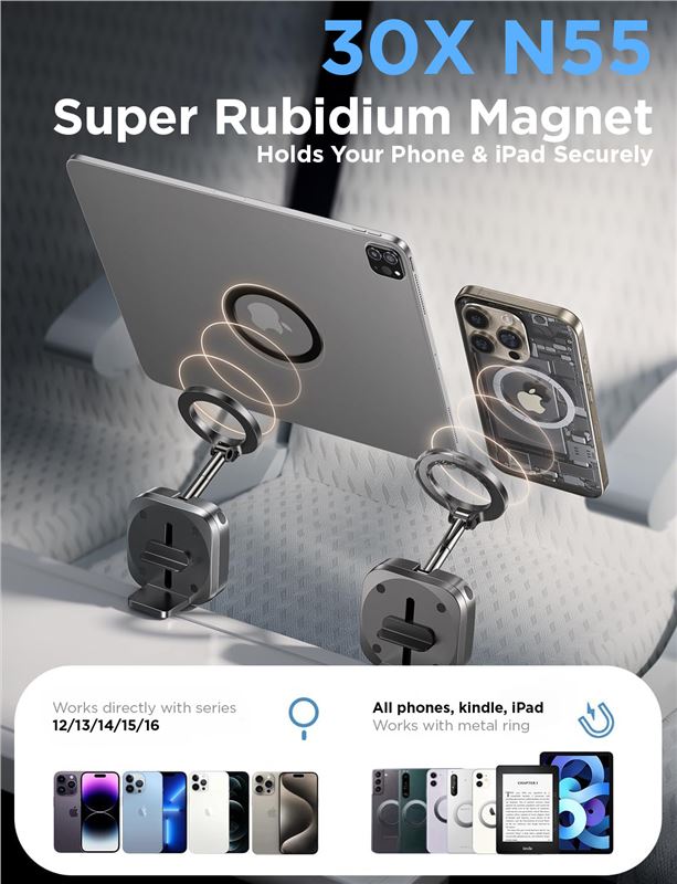 Featuring a robust 30X N55 magnetic mount, this compact, foldable holder ensures your device stays securely in place. With 360° rotation, you can easily adjust your phone for perfect viewing angles, whether on a plane, train, or at your desk. Crafted from premium materials, it guarantees durability and compatibility with iPhone models 12 through 15, as well as other smartphones and tablets.