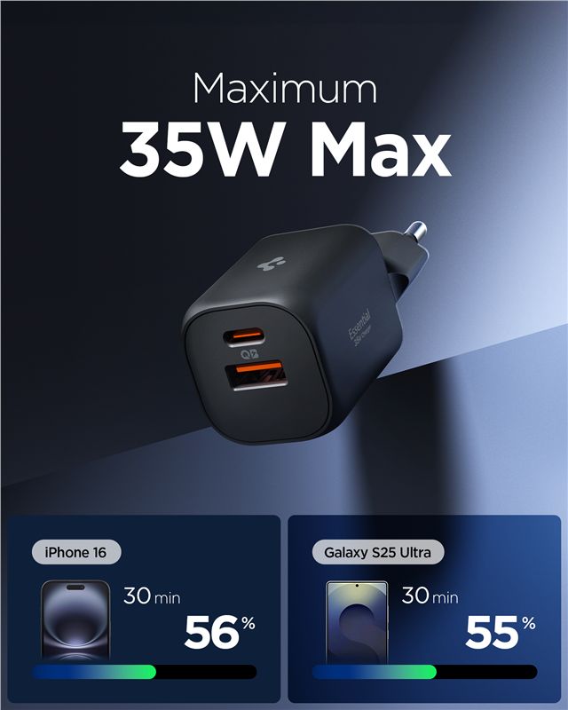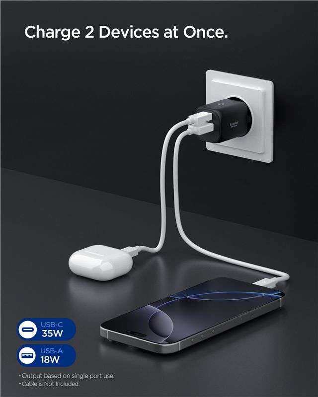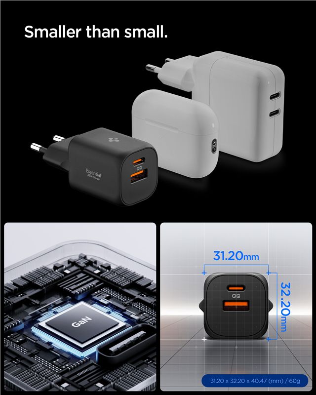 Compact and powerful charger. This 35W Spigen Essential charger provides fast and efficient charging for two devices simultaneously, all in an exceptionally small GaN body.
