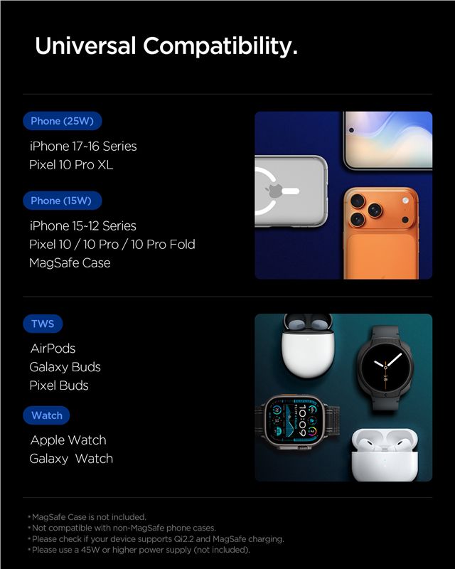 Τριπλή Ταυτόχρονη Φόρτιση: Φορτίστε το τηλέφωνο (έως 25W), το Apple ή Galaxy Watch (2.5W) και τα ασύρματα ακουστικά σας (5W) ταυτόχρονα.