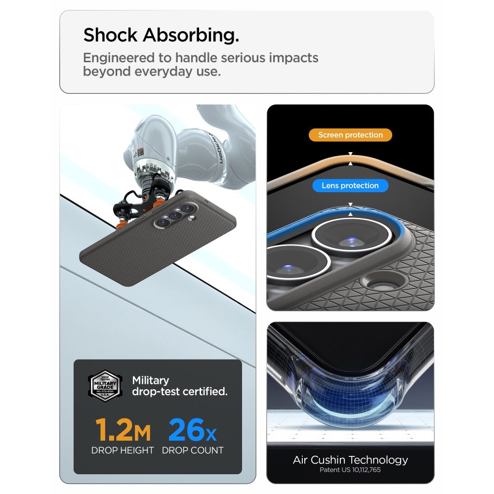 Τεχνολογία Air Cushion®: Η πιστοποιημένη προστασία στρατιωτικού επιπέδου της Spigen θωρακίζει τις γωνίες του S26+ Plus, απορροφώντας τους κραδασμούς από κάθε πτώση.