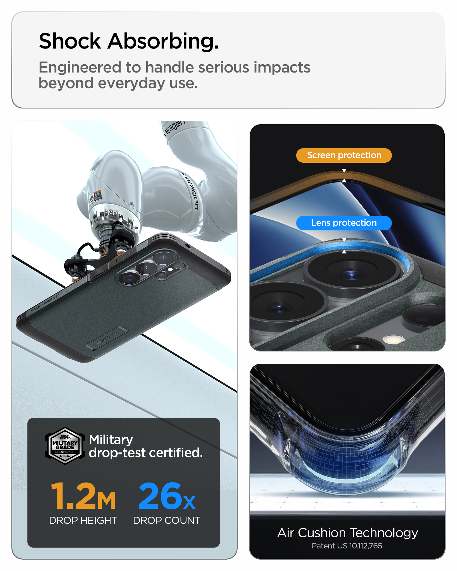 Τεχνολογία Air Cushion: Οι γωνίες της θήκης είναι ενισχυμένες με θύλακες αέρα που λειτουργούν ως αμορτισέρ, παρέχοντας πιστοποιημένη προστασία στρατιωτικών προδιαγραφών (Mil-Grade).