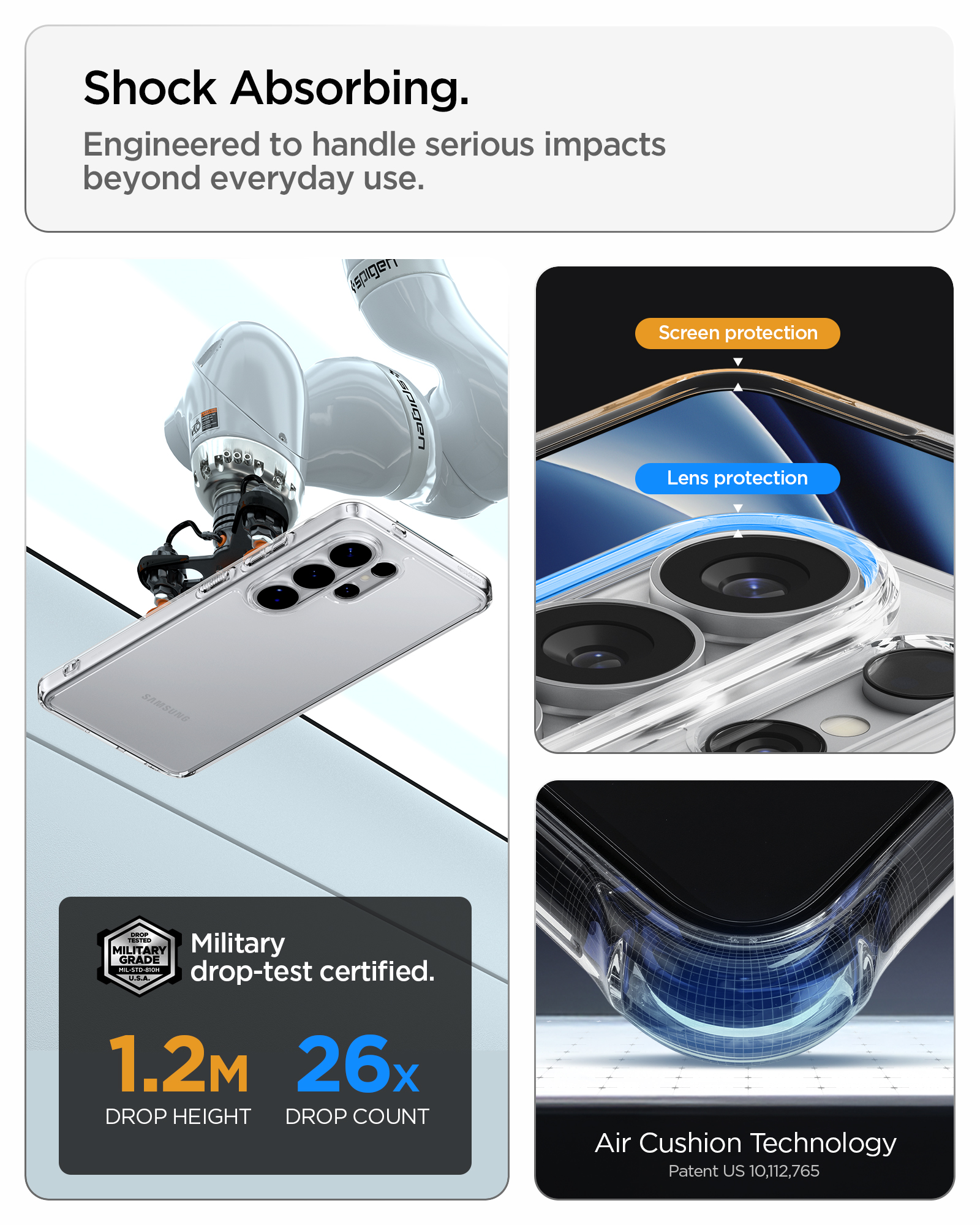 Τεχνολογία Air Cushion®: Οι γωνίες είναι ενισχυμένες με την πατενταρισμένη τεχνολογία της Spigen, προσφέροντας πιστοποιημένη προστασία στρατιωτικού επιπέδου (Mil-grade) από πτώσεις.