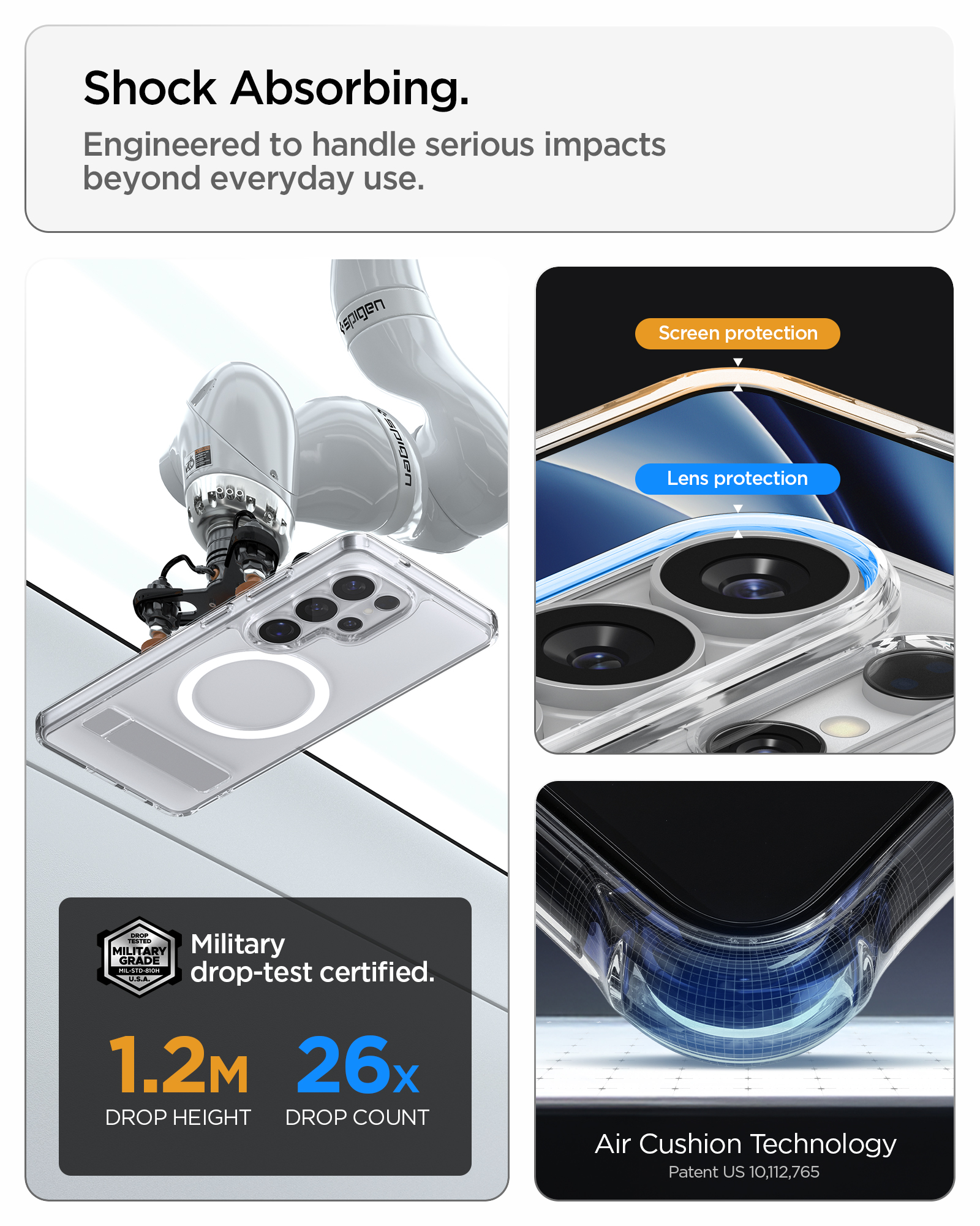 Πιστοποίηση Mil-Grade: Με την τεχνολογία Air Cushion στις γωνίες, η θήκη απορροφά τους κραδασμούς από πτώσεις, προσφέροντας προστασία στρατιωτικών προδιαγραφών σε ένα λεπτό προφίλ.