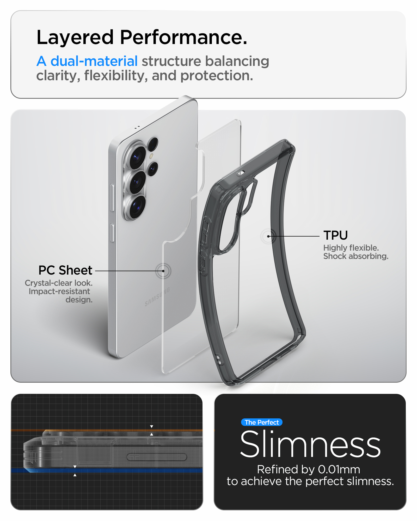 Υβριδική Τεχνολογία: Κατασκευασμένη από έναν σκληρό πολυανθρακικό (PC) σκελετό στην πλάτη και έναν εύκαμπτο προφυλακτήρα TPU περιμετρικά, προσφέροντας διπλή στρώση προστασίας.