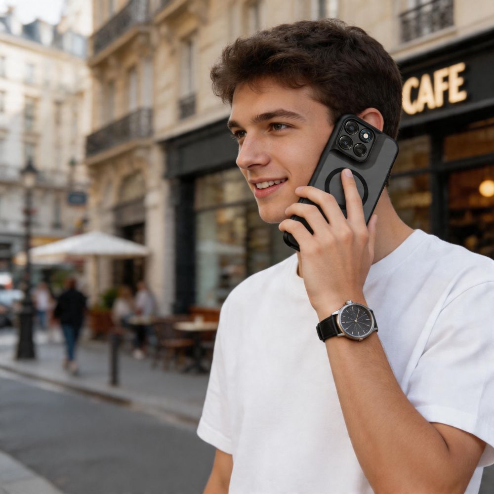 Ο ενσωματωμένος μαγνητικός δακτύλιος MagSafe επιτρέπει τη χρήση συμβατών αξεσουάρ, όπως βάσεις και πορτοφόλια, χωρίς να αφαιρείται η θήκη. Οι ανυψωμένες άκρες προστατεύουν την οθόνη και την κάμερα από επαφή με επιφάνειες.