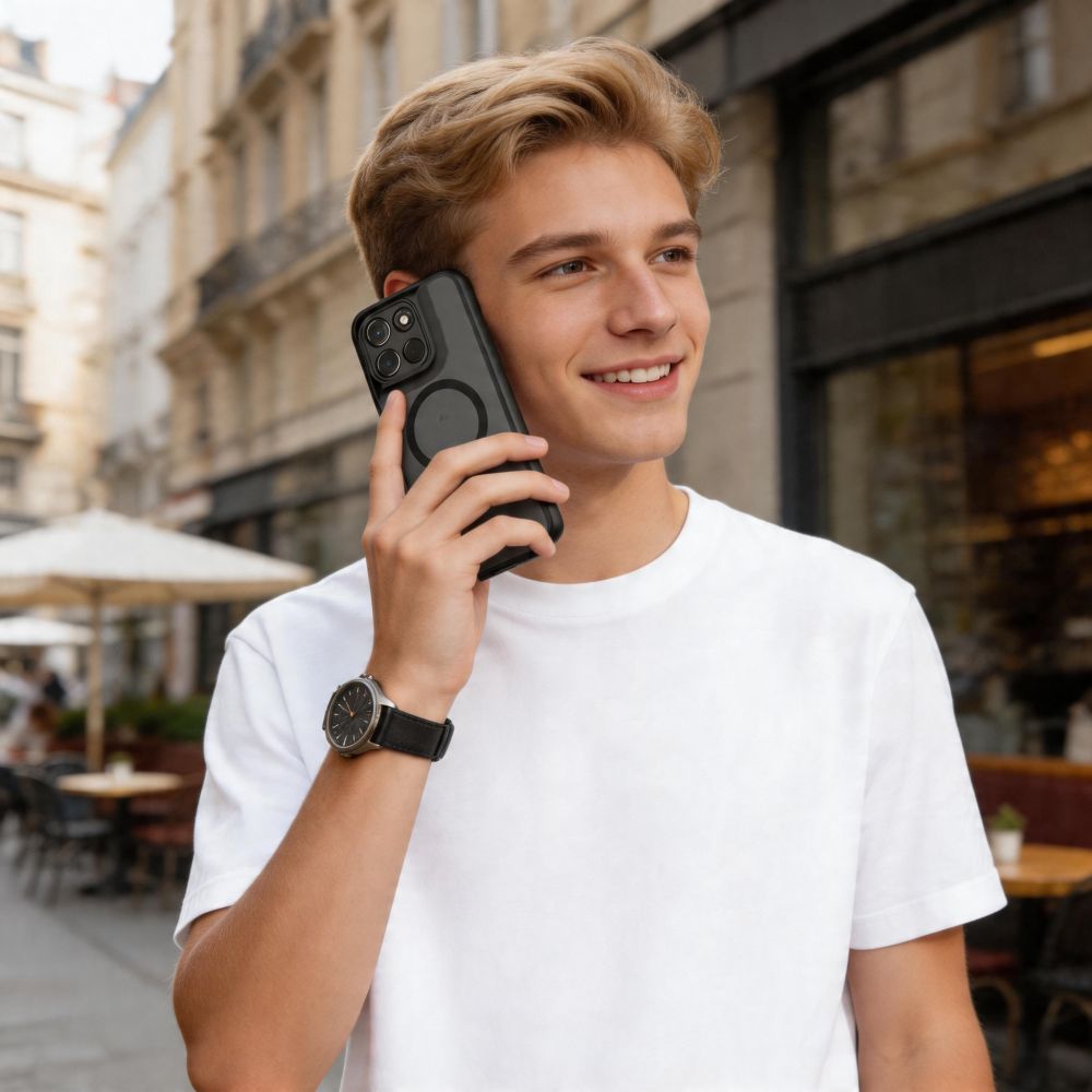 Ο ενσωματωμένος μαγνητικός δακτύλιος MagSafe επιτρέπει τη χρήση συμβατών αξεσουάρ, όπως βάσεις και πορτοφόλια, χωρίς να αφαιρείται η θήκη. Οι ανυψωμένες άκρες προστατεύουν την οθόνη και την κάμερα από επαφή με επιφάνειες.