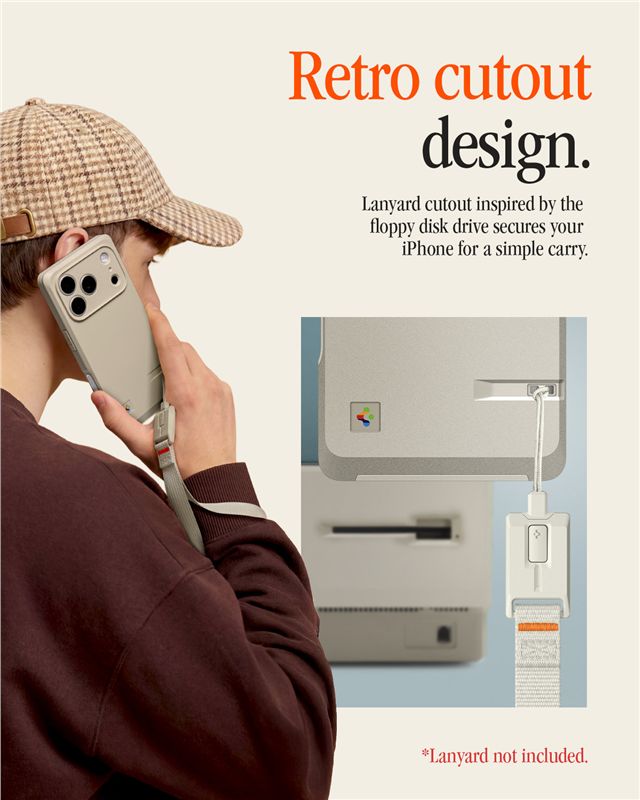 Hołd στο 1984: Το ματ φινίρισμα και η απόχρωση Stone αναπαράγουν την αίσθηση των πρώτων υπολογιστών Apple. Στην πλάτη υπάρχει μια διακριτική εσοχή που παραπέμπει στη μονάδα δισκέτας 3.5 ιντσών, ενώ το λογότυπο της Spigen έχει επανασχεδιαστεί με το εμβληματικό «ουράνιο τόξο» των 80s.