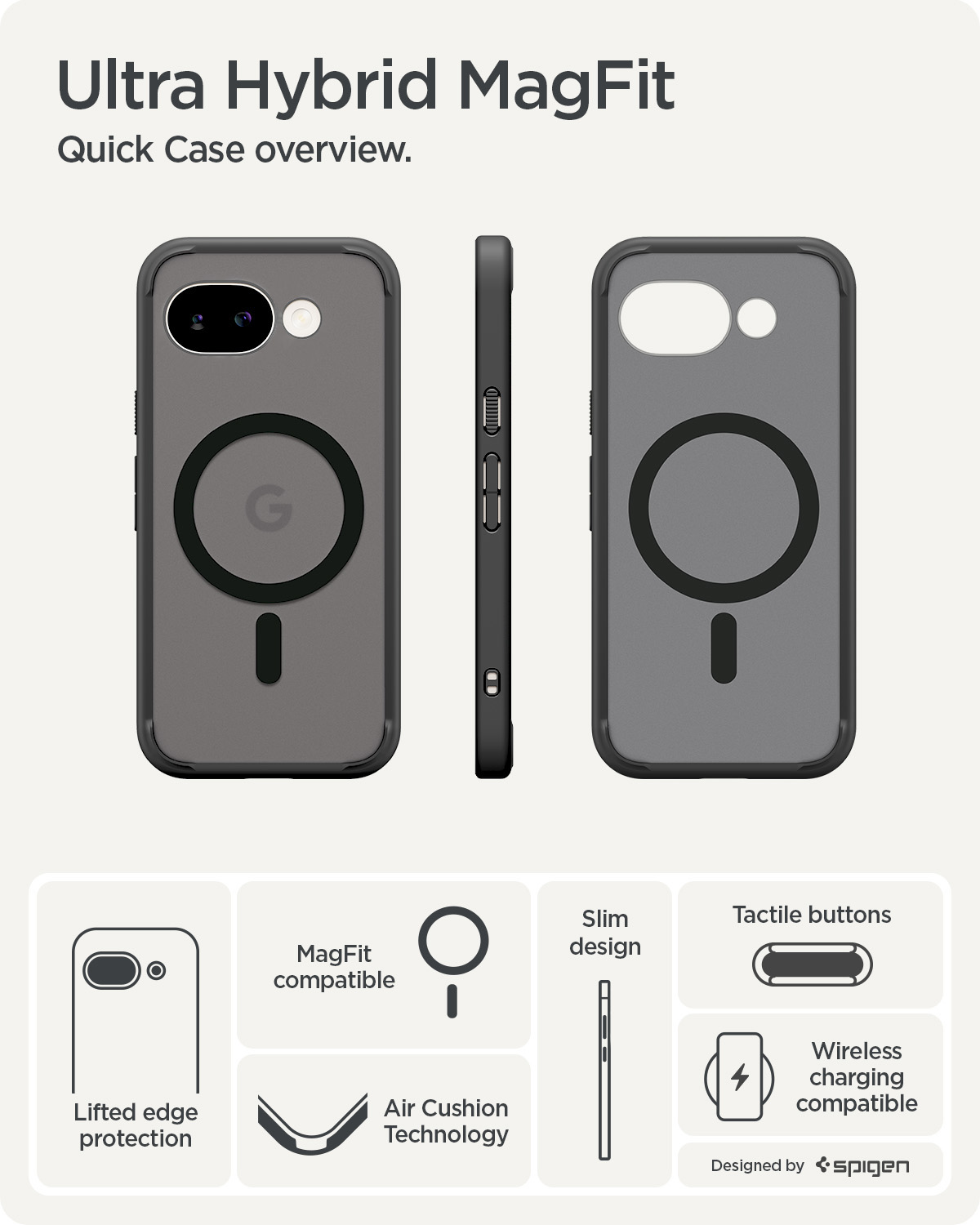 Η Spigen Ultra Hybrid MagSafe έχει μελετηθεί για να προσφέρει ασφάλεια χωρίς συμβιβασμούς. Τα υπερυψωμένα πλαίσια γύρω από την οθόνη και την κάμερα διασφαλίζουν ότι οι φακοί και το πάνελ δεν θα έρθουν σε επαφή με σκληρές επιφάνειες, αποφεύγοντας έτσι τις γρατσουνιές. Τα εργονομικά κουμπιά παρέχουν εξαιρετική απόκριση, ενώ οι ακριβείς εγκοπές εγγυώνται την απρόσκοπτη πρόσβαση σε όλες τις λειτουργίες του Google Pixel 10a.