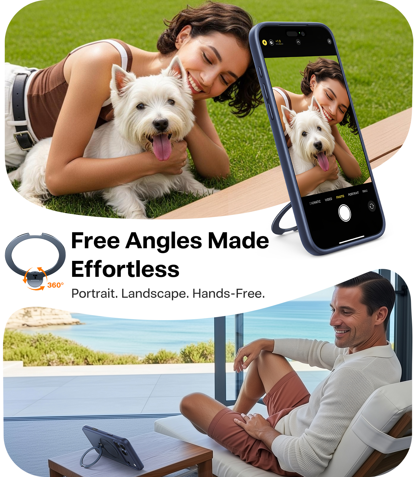 Περιστρεφόμενη Βάση 360°: Ο ενσωματωμένος μεταλλικός δακτύλιος στην πλάτη περιστρέφεται πλήρως, επιτρέποντάς σας να στηρίξετε το iPhone 17 Pro σε οποιαδήποτε γωνία επιθυμείτε. Είναι ιδανικός για hands-free προβολή περιεχομένου, βιντεοκλήσεις ή ανάγνωση, σε οριζόντια ή κάθετη διάταξη.