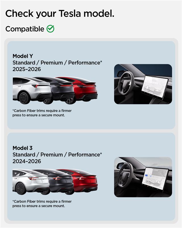 Η βάση TAM100 είναι συμβατή με το Tesla Model 3 (2024-2026) και το Tesla Model Y (2025-2026 Juniper) σε όλες τις εκδόσεις (Standard/Premium/Performance). Σημείωση: Σε εσωτερικά με επένδυση Carbon Fiber, απαιτείται ελαφρώς πιο έντονη πίεση κατά την τοποθέτηση για τη διασφάλιση της μέγιστης σταθερότητας.
